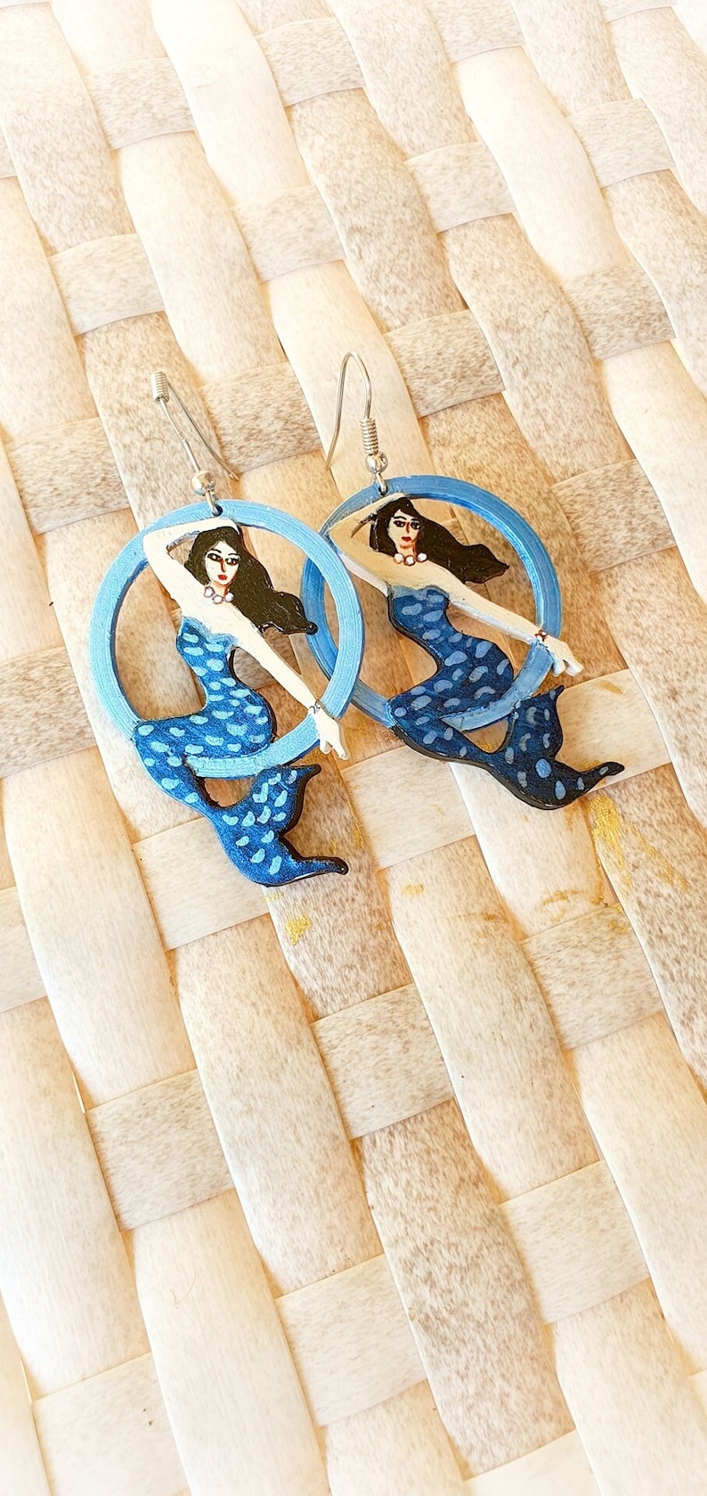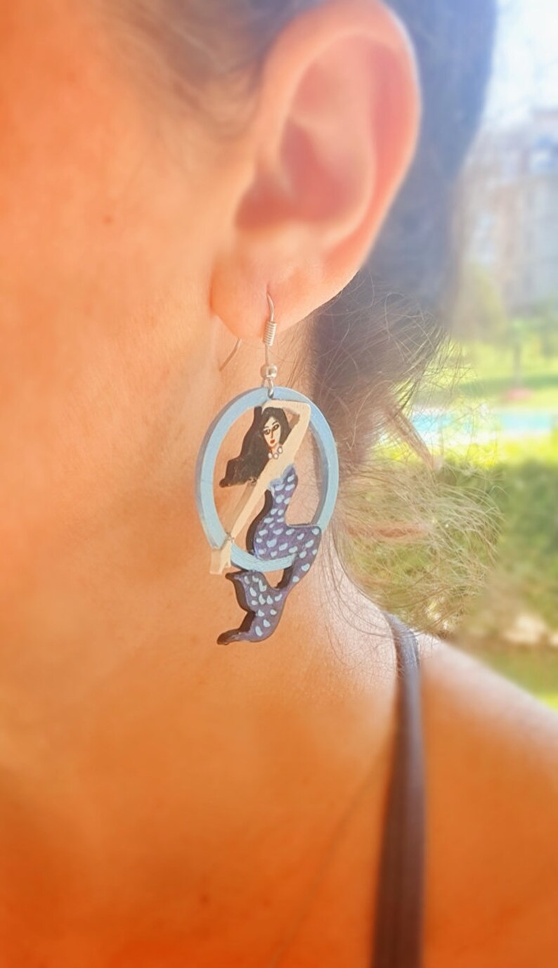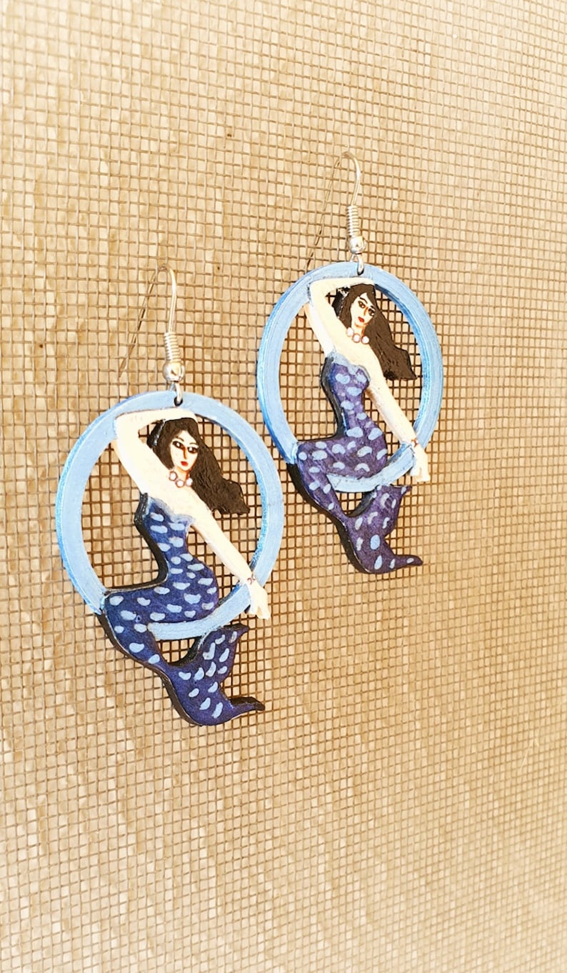 Renkli, bohem, el boyama, özgün tasarım deniz kızı küpeler.