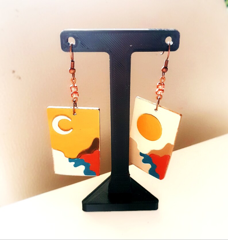Şık ve Benzersiz Ay ve Güneş temalı Boho Küpe – Özgün Tasarım & El Boyaması