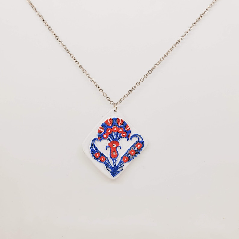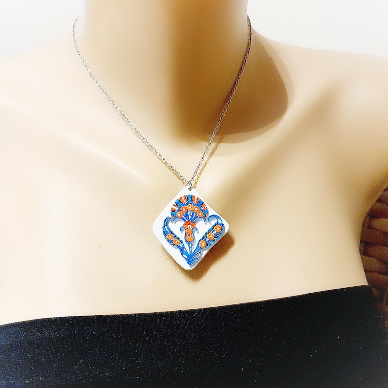 İznik çiçek motifli kabartmalı el yapımı kolye