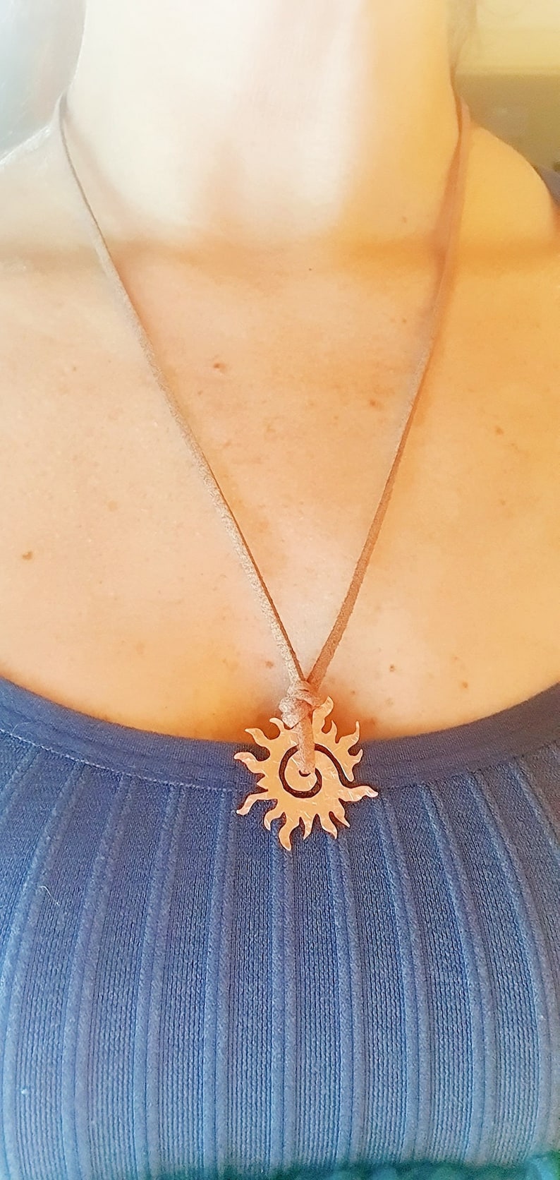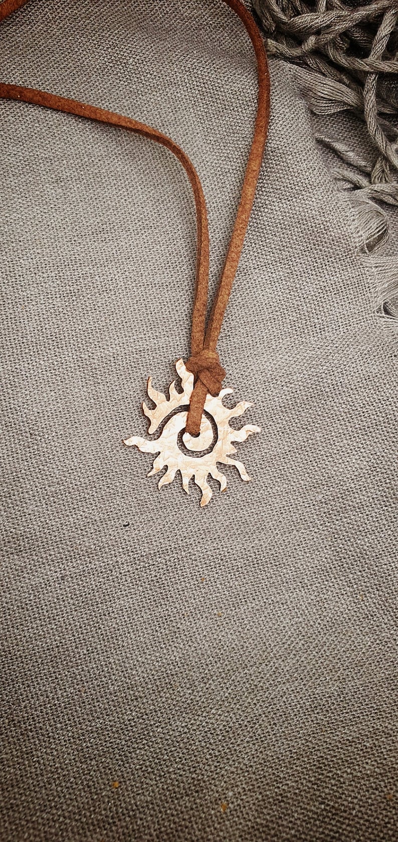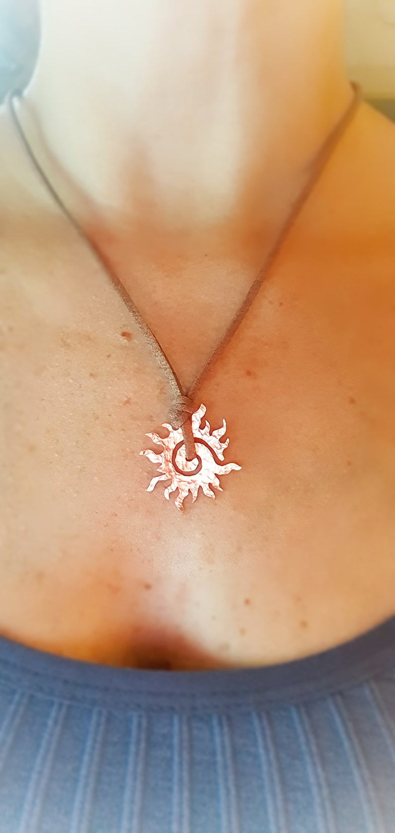 El yapımı benzersiz güneş temalı bakır kolye. Özel tasarım, ve el yapımıdır, bakır çekiçlenerek özel doku verilmiştir. Deri ip kullaılmış olup, ayarlıdır.